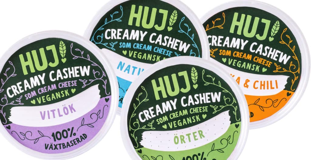 Huj är ett lite mindre känt märke som säljer färskost gjort på cashewnötter Färskostarna finns i fyra olika smaker och är alla riktigt goda och krämiga. Nackdelen är att de är lite dyrare än andra veganska färskostar.