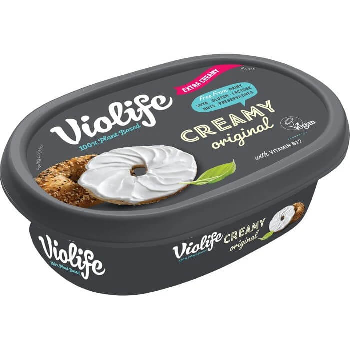 Violife har en 100% vegabsj färskost som är mycket krämig. Den är neutral i smaken och fungerar bra använda i stället för smör på mackan eller i bakning. Smaken är neutral och helt fri från laktos, gluten och nötter.